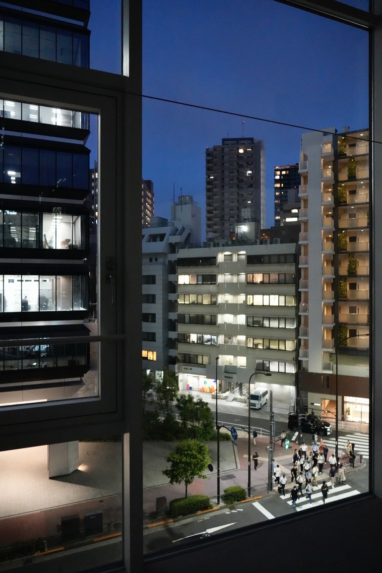 ガラス越しに映る横断歩道を行き交う会社員やこどもたち、信号待ちをするタクシーなど。芝浦の日常が非日常として見える不思議な体験をもたらします ( model: Kaho Kogure )