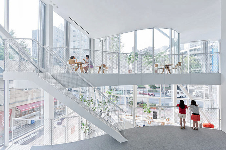 5階建ての建物ですが、スキップフロア構造(床の高さが一部異なる)になっており、上下の階層がユニークな階段でつながります。建物全体はガラスで覆われ、内部の活動を外から眺めることができます。周囲との一体感を生み出す、とても斬新な空間が完成しました。