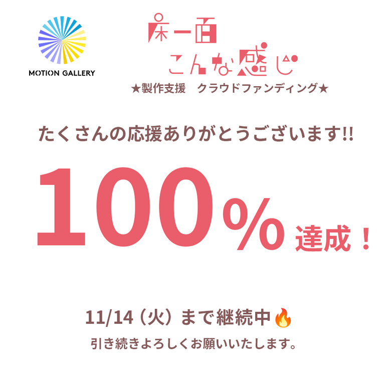 昨日、ついに映画『床一面こんな感じ』製作支援プロジェクトが目標額である90万円を達成いたしました。
