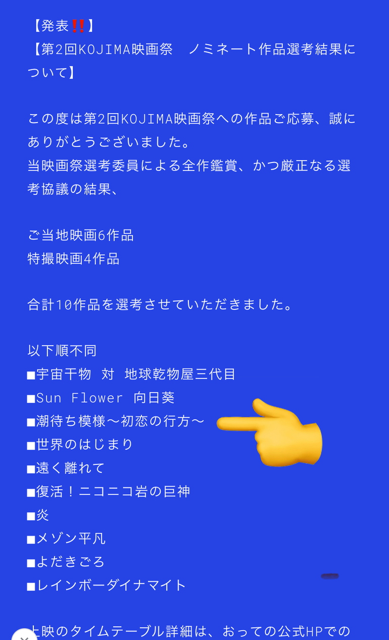 12月に開催されるKojima映画祭におきまして【潮待ち模様〜初恋の行方〜】が10作品の一つとしてノミネートされました事をご報告させて頂きます。