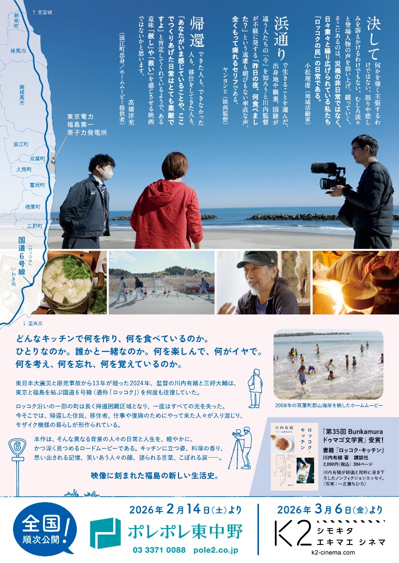映画「ロッコク・キッチン」は2月14日から東京(ポレポレ東中野、シモキタエキマエシネマK2)、東北(まちポレいわき、フォーラム福島、フォーラム仙台)、北海道(シアターキノ)、関西(出町座、元町映画館、シネヌーヴォ)、長野(上田映劇)、鹿児島(ガーデンズシネマ)などで順次公開が始まります。(詳しい劇場情報はウェブサイトをご覧ください)