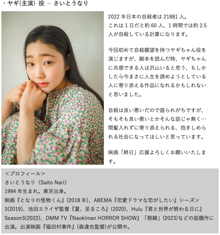 ※自殺を単純化または美化したり、非現実的なものとして描くことのないよう、表現には十分注意して制作いたします。