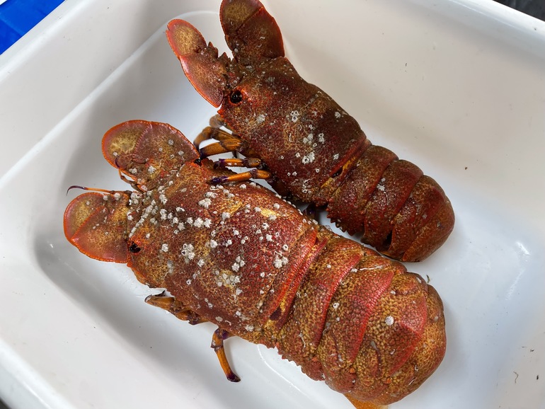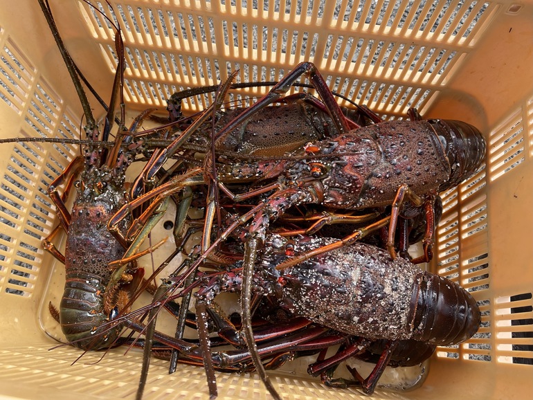 「水揚げされたくつえび、伊勢海老を活きたままお届けします」