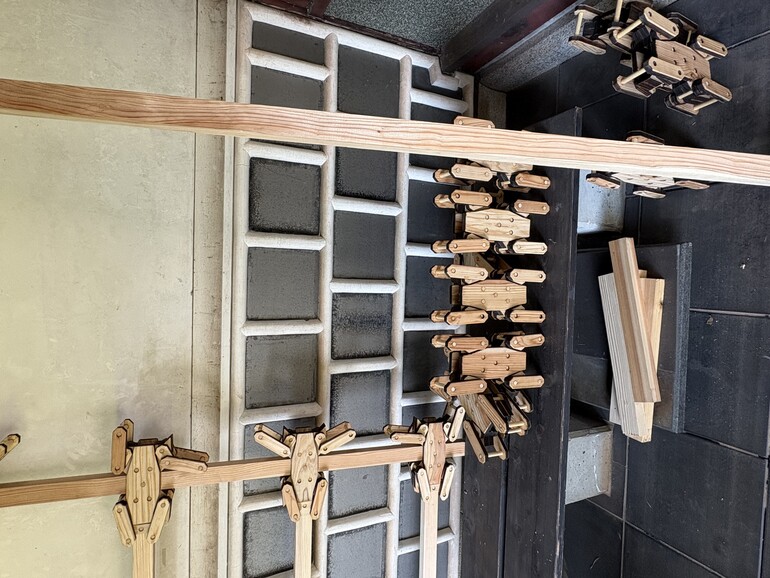 枠の木組みの固定は、杉太郎さんが発明した小国杉で作られたパッチン錠のようなものを使っていただきました。釘などを使わず木組みするので解体も簡単にでき、再利用することもできます。何よりこの固定具は、ただの道具と呼ぶにはもったいないほどデザイン性があってかっこいいので、芸術祭にとてもピッタリな感じになりました。杉太郎さんありがとうございました!