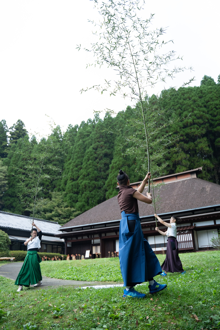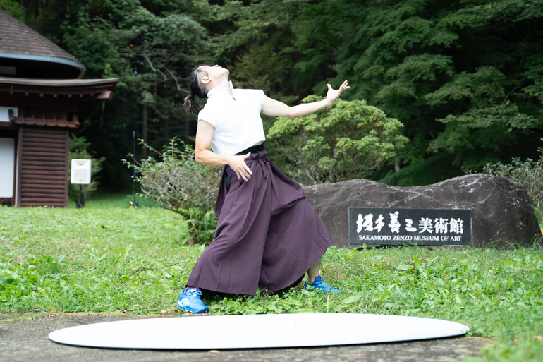 この作品のベースになっているのは、日本最古のSF文学ともいわれる「竹取物語」。坂本善三美術館の建物を背景に、その前に広がる緑の庭を舞台として上演されました。 袴を履き、しなる竹を手にした3人のダンサーが現れると、会場の空気がすっと変わり、その空間だけでなく時代まで変わったような不思議な錯覚を覚えました。