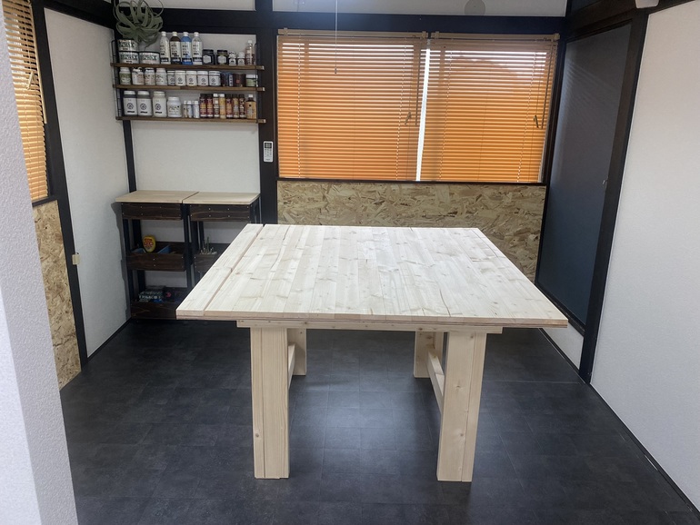工作室に欠かせない工作台ですが、スペースに合わせて、広々と使えるように1200㎜×1200㎜の大きさにしました。既成の板の幅は900㎜までしかないので、天板は1×4材で張り合わせて作りました。