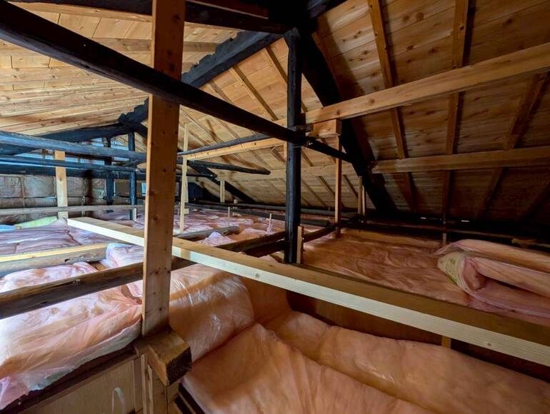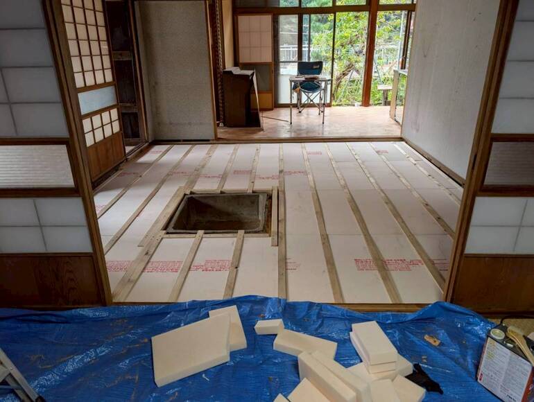 今回の施工では、私たちが先日の合宿で畳を剥がした部分の基礎直し、キッチン部分の床の張替、天井の断熱材の敷き込みや壁づくりを行いました。