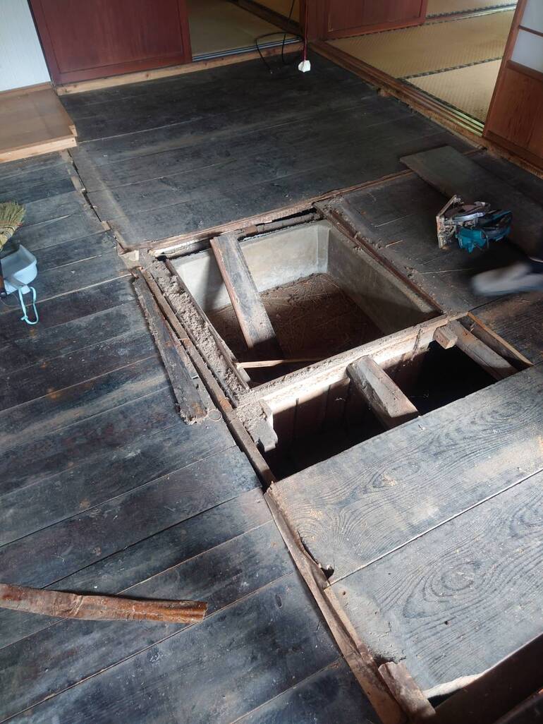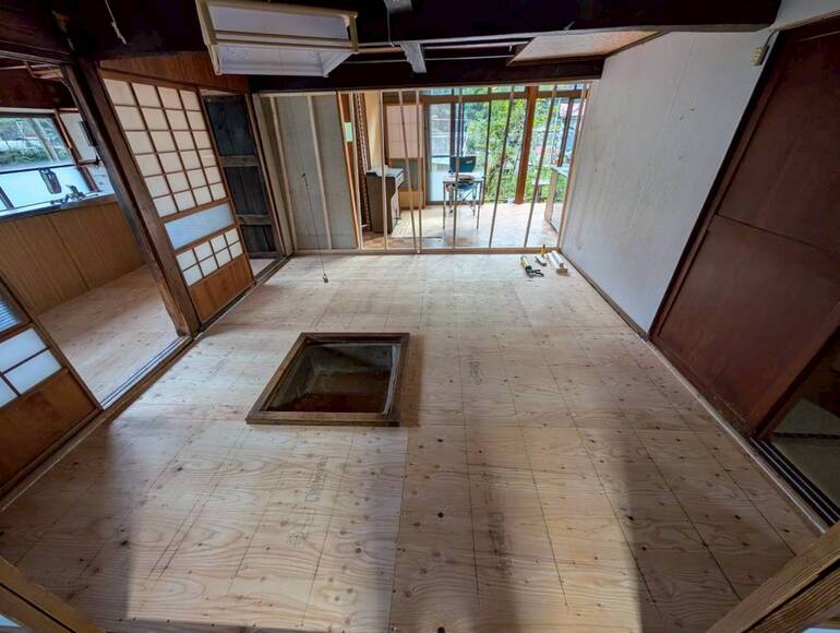 このシェアハウスの魅力の一つである囲炉裏を活かした空間作りが可能か現場で判断していただきました