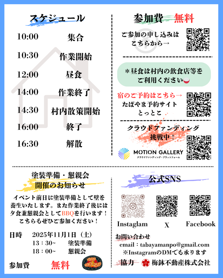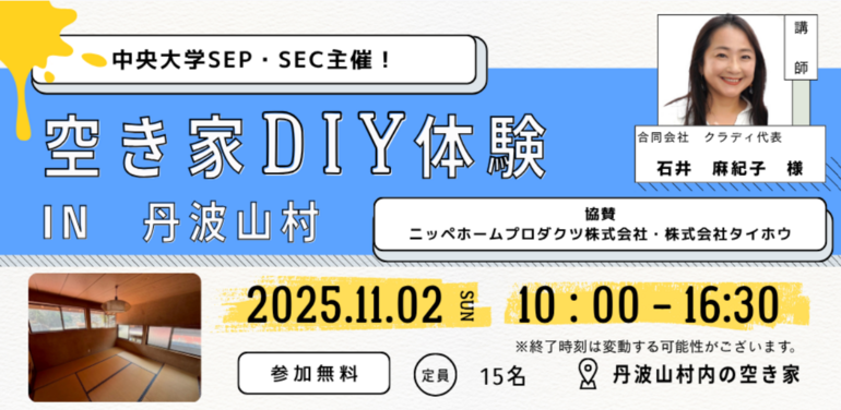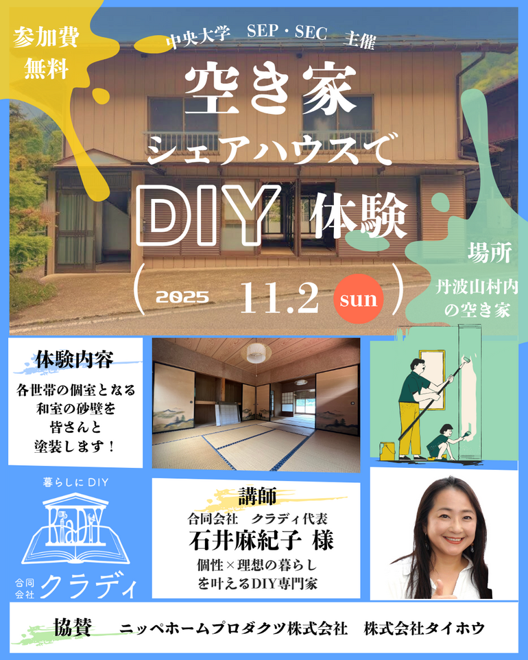 今回のイベントは空き家活用、DIYに興味がある方、このクラウドファンディングに興味を持ってくださった方に実際に空き家に足を踏み入れていただき、私たちとともにDIYを体験していただける内容になっています。