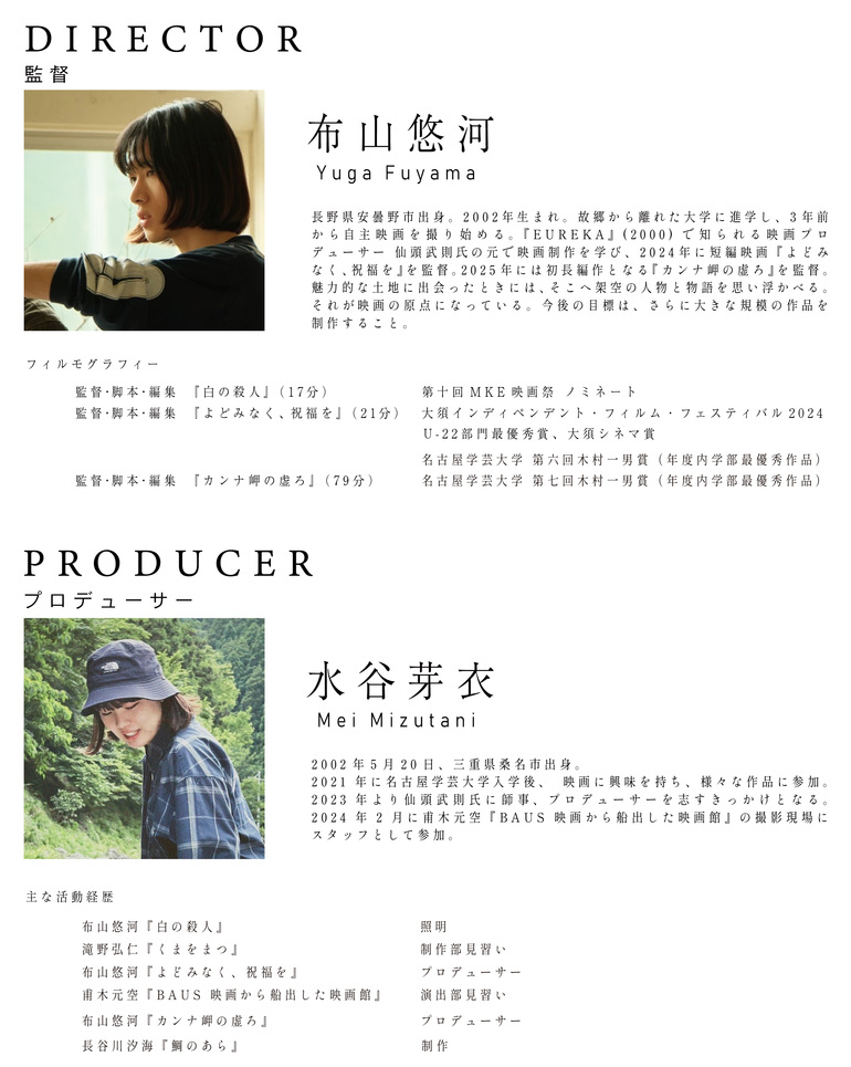 名古屋学芸大学 仙頭ゼミ4年 ↓活動経歴 ・布山悠河監督『白の殺人』('22)/照明(MKE映画祭ノミネート) ・布山悠河監督『よどみなく、祝福を』('23)/プロデューサー(大須IFF入選作品、木村一男賞受賞) ・滝野弘仁監督『くまをまつ』/制作部見習い(東京国際映画祭Nippon Cinema Now部門招待作品) ・甫木元空監督『BAUS 映画から船出した映画館』/演出見習い その他多数CM制作、学生映画作品に参加