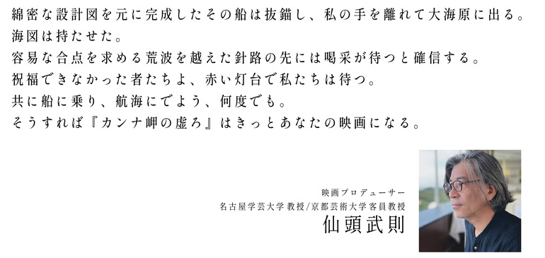 本作『カンナ岬の虚ろ』は、スタッフ、キャスト全員が並々ならぬ思いをもって制作をいたしました。また、撮影やその他の面においても多くの方々が応援をしてくださり、素晴らしい作品に仕上がりました。
