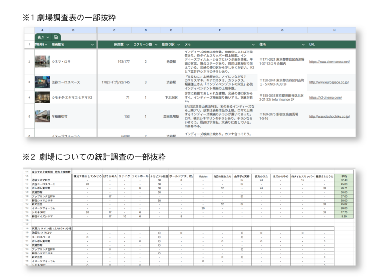 これまでの活動を紹介し、本クラウドファウンディング実施に至った経緯を説明いたします。3月本編完成の後、私たちは大学を卒業し上京をしました。東京には数多くのミニシアターがあるため、自ら足を運び座席数や立地、上映作品の特徴などを調査(※1)し、監督、プロデューサーで情報共有、話し合いを行い『カンナ岬の虚ろ』をどこで上映したいのか候補を絞っていきました。また、都内のどの劇場で上映をすれば、より地方劇場へ広がっていくかということも考えるべく、劇場同士や配給会社も含めた関係性を明確にするため複数作品を抜粋し統計調査を行いました。(※2)