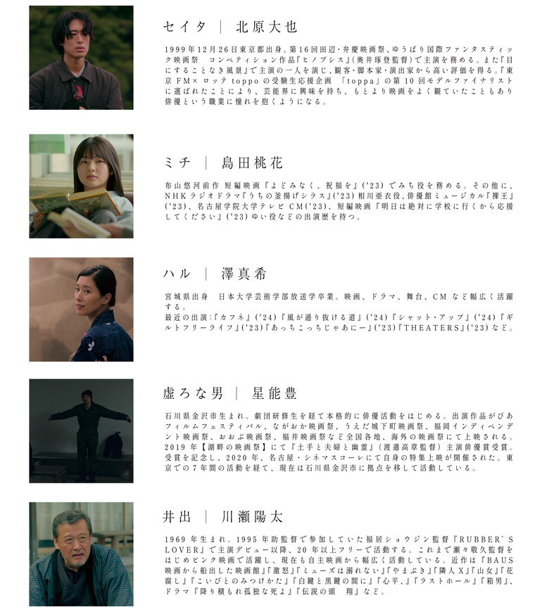 セイタ役は、第16回田辺・弁慶映画祭、ゆうばり国際ファンタスティック映画祭ノミネートの『ヒプノシス』(奥井琢登監督)でも主演を務めた北原大也。監督の前作短編『よどみなく、祝福を』に引き続き、社会からはぐれて生きる少女、ミチを演じるのは、島田桃花。美しくも何処か寂しさを感じる声でハル役を演じるのは、近年のインディペンデント映画で出演機会を増やす澤真希。作品後半に唐突に差し込まれる“虚ろな鳥のダンス”シーンで鮮烈な印象を残すのは、石川県出身の俳優、星能豊。そして、故郷の終わりを見つめる男である井出を演じ、本作全体を支える柱を担うのは、ベテラン俳優の川瀬陽太。
