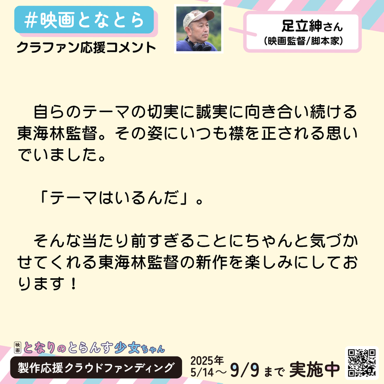 朝ドラ『ブギウギ』などの脚本家で映画監督としても活躍中の足立紳さんから東海林監督へ応援のエールをいただきました!ありがとうございます。