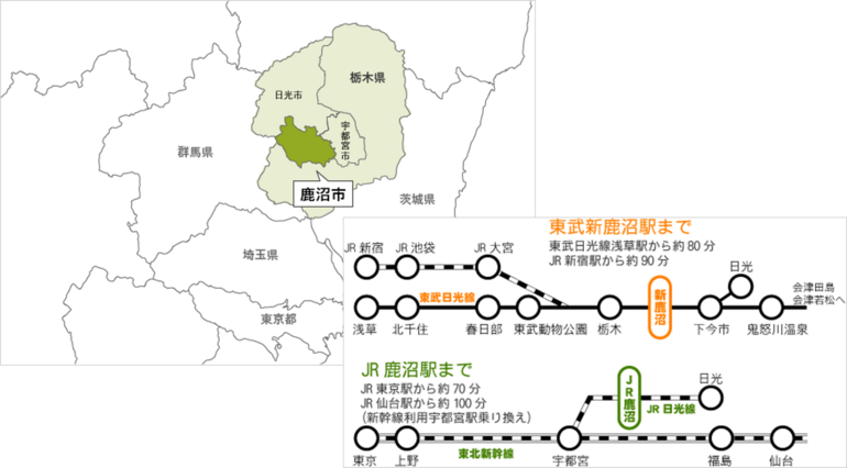 栃木県の中西部に位置し、宇都宮市と日光市に隣接する、自然と文化に彩られたまち「鹿沼」。東京から100km圏内にあり、車でも電車でもアクセス性に優れた場所です。