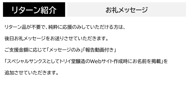 今回、トリイ堂醸造の立ち上げを応援してくださる方から応援メッセージをいただいておりますので、一部を紹介させていただきます。応援してくださる方々の期待に応えられるよう、美味しいビールを一生懸命作っていきます!