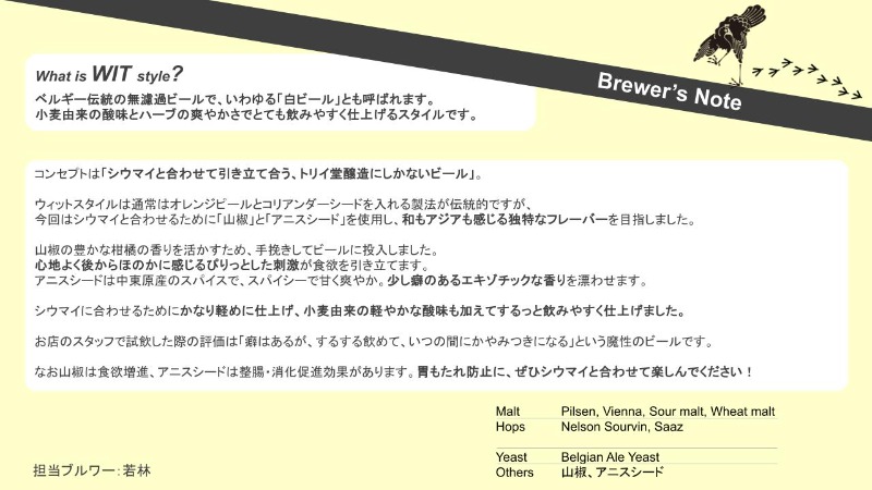 ウィットスタイルは通常はオレンジピールとコリアンダーシードを入れる製法が伝統的ですが、今回はシウマイと合わせるために「山椒」と「アニスシード」を使用し、和もアジアも感じる独特なフレーバーを目指しました。