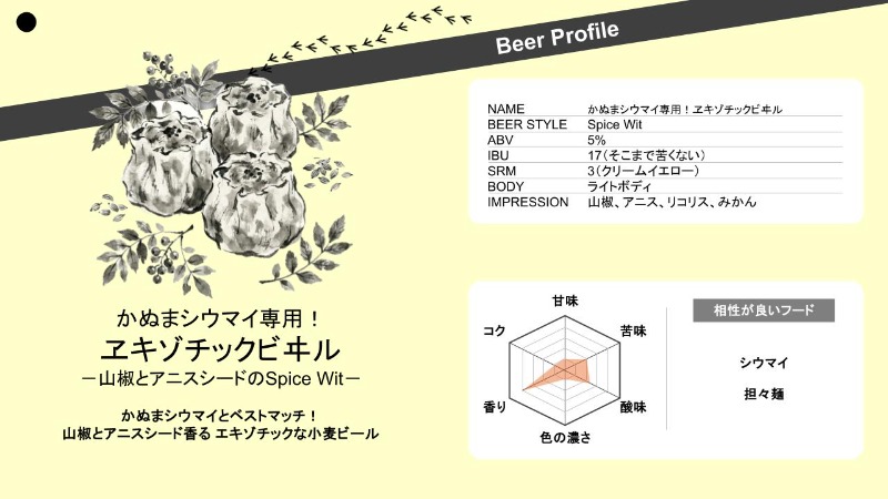 シウマイに合わせるためにかなり軽めに仕上げ、小麦由来の軽やかな酸味も加えてするっと飲みやすく仕上げました。