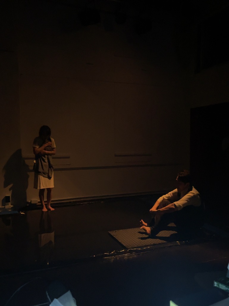 三鷹SCOOLの床面は凹凸が激しく水面を平行にすることが困難ため、均一になるように水槽内に段差を設置し、安全面の担保と視覚的な効果の両立を追い求め、21日は2公演とも水槽を用いて上演しましたが、22日に関しては本水を用いず上演を行うことにいたしました。今回のアップデートでは、この演出の変更についてご報告させていただきます。