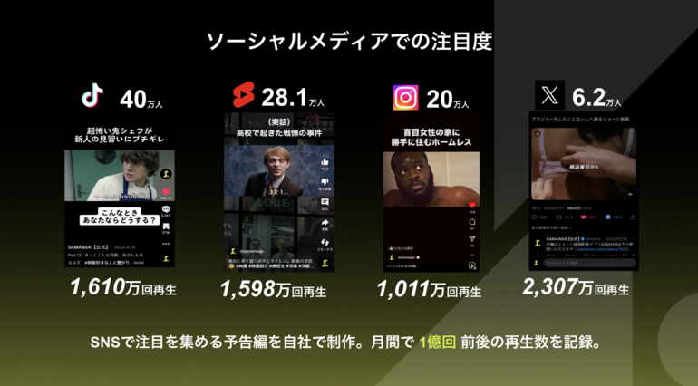 SAMANSAは主な出資提供者、そしてエグゼクティブプロデューサー(脚本選考・予算決定・制作に携わる重要事項の決定承認)として、「SAMANSA」での独占配信、それに伴う宣伝を担い、クリエイターの方々を全面サポートさせていただきました。