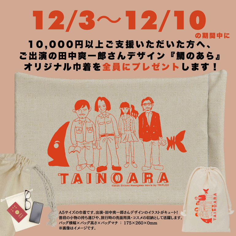 ショート映画を全面支援する新プロジェクト『TRIPLEX』で応募総数200以上から選ばれた、待望の第一弾・長谷川汐海監督作品『鯛のあら』を日本全国、そして世界へ一緒に届けてくださるサポーターを大募集します!