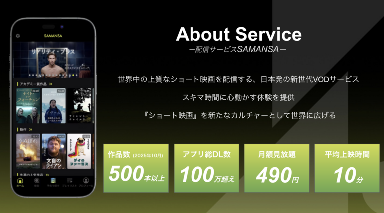 「映画の感動を、10分で」SAMANSAは世界中の良質で面白いショート映画・ドラマ・ドキュメンタリーを発掘して配信しているプラットフォームです。