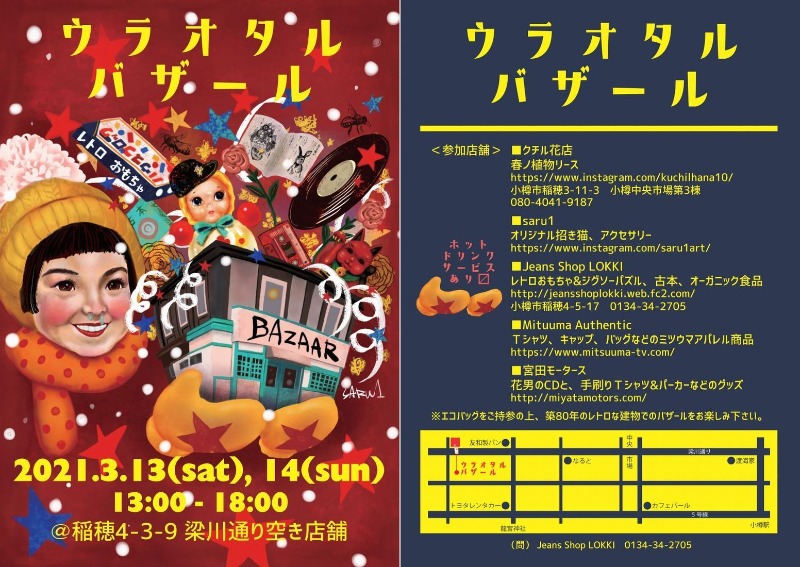 当時、「裏小樽オーセンティック」というyoutube番組をやっていた仲間たち(Mitsuuma Authentic、クチル花店、saru1、ジーンズショップロッキ、そして宮田モータース)でスタートし、同年5月に第二弾、7月に「ウラオタルBaza-Art」へと展開していきました。
