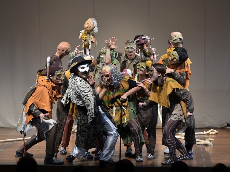 伝令の神ヘルメス(みっつん)と、彼に『平和』の女神の救出を、と歌い踊りながら詰め寄るコロスたち。