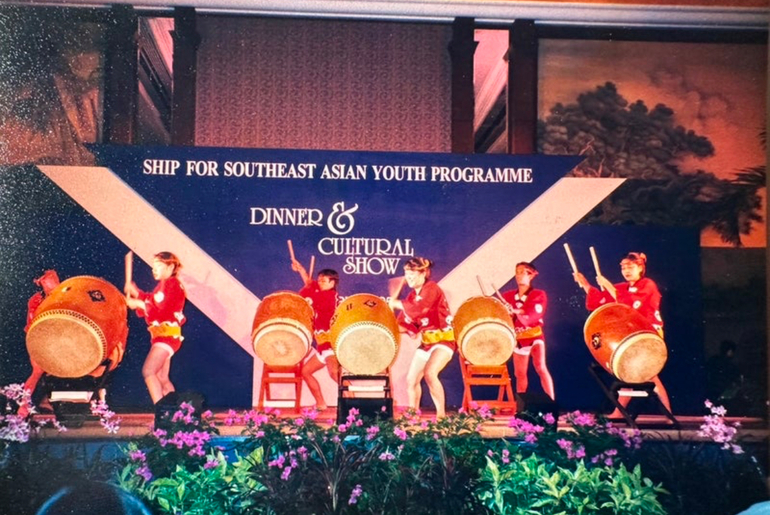 余談ですが船内、そしてシンガポールのShangri-laホテルの歓迎会で和太鼓を叩いたのが、僕の人生の舞台デビューでした(写真後列右:当時はまだフラメンコを踊ってません)