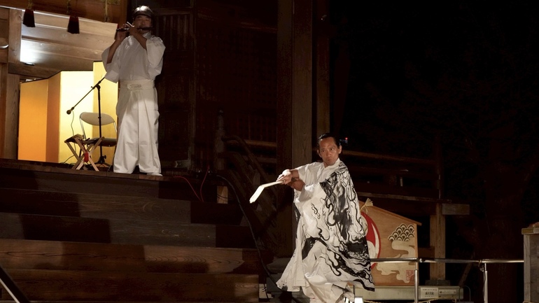 神楽公演で伊弉諾/伊弉冉尊を演じる永田と山本