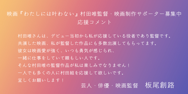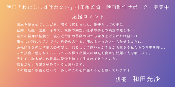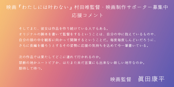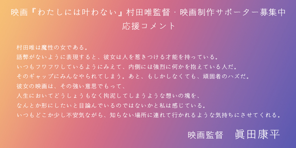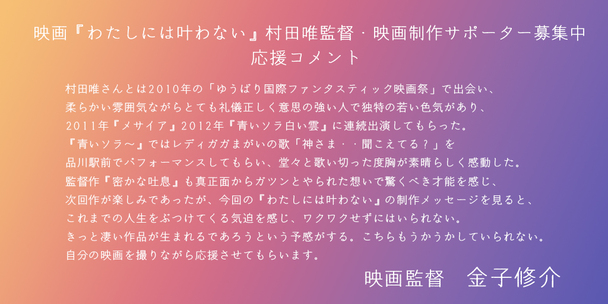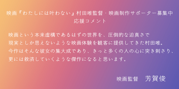 みなさま色んな思いと生活があると思いますが、もしもご賛同いただけましたら皆さまの様々な方法で、可能な限りで、『わたしには叶わない』制作の応援をしていただけましたら幸いです。