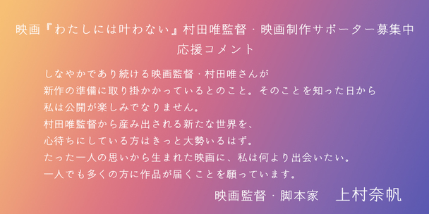 村田唯監督・長編第二作目『わたしには叶わない』の映画製作費サポーター募集アカウント。アートとライフの狭間で“子育て・夫婦・生きる“を問う、村田唯が人生を賭けたプロジェクト!