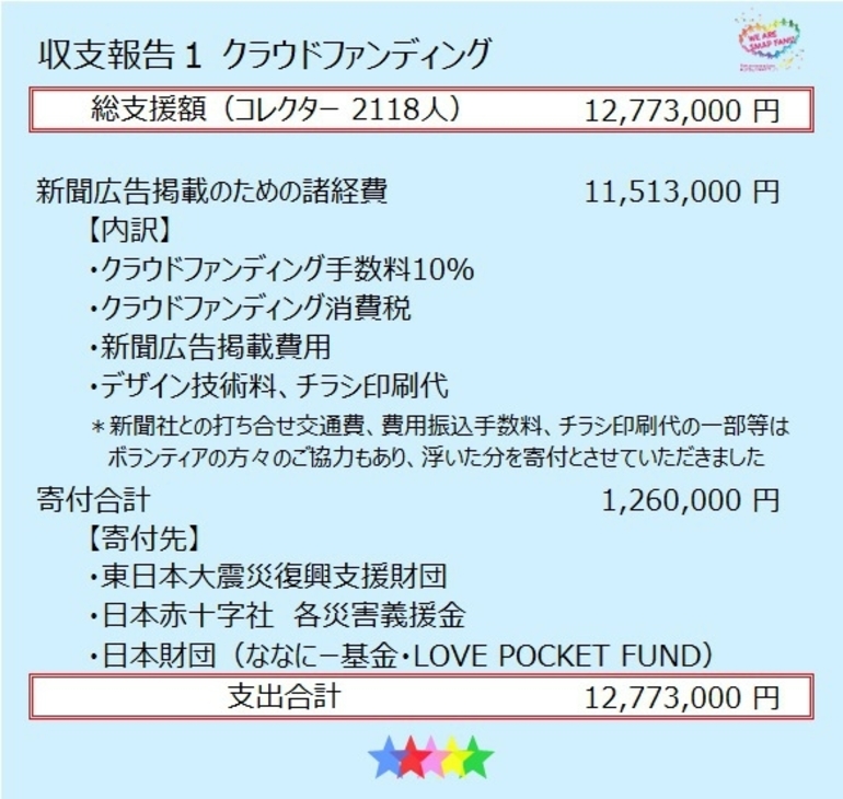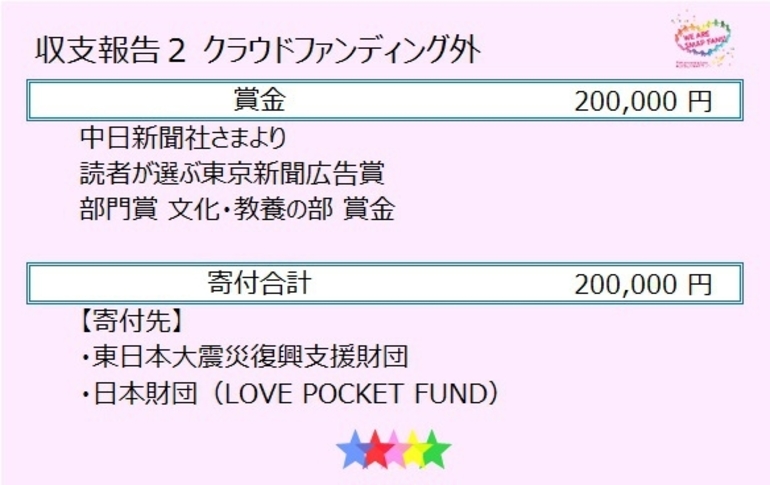 今回は、『みんなで伝えよう! 新聞広告でSNSで「令和もSMAPファン」宣言!』プロジェクトの最終の収支報告をさせていただきます。