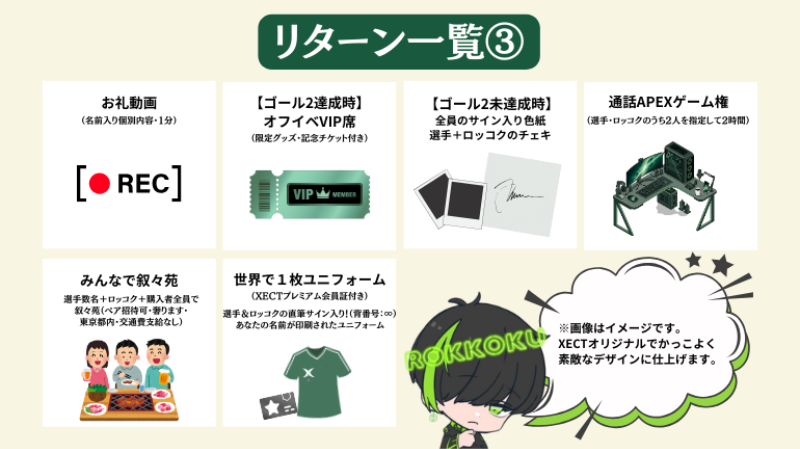 ストレッチゴール2達成時は「オフラインイベントVIP席(座席は支援順・限定グッズ・記念チケット付き)」、ストレッチゴール2未達成時は「選手+ロッコクのサイン色紙&チェキ」のご送付となります。