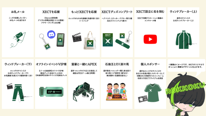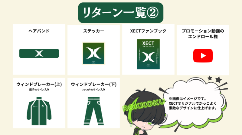 チーム「XECT」選手全員+運営メンバーのアイコン用イラスト制作 ・チーム「XECT」のプロモーション映像制作 ・チーム「XECT」選手全員+代表の宣材写真撮影 ・Webサイト制作(デザイン・コーディング・サーバー代) ・リターン品制作費 ・リターン品郵送代 ・クラウドファンディングページのデザイン外注費 ・リターン品のデザイン外注費 ・リターン品の発注・配送作業外注費 ・クラウドファンディング手数料