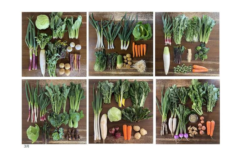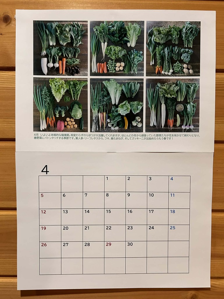 スタッフが撮りためた過去の農場の野菜セットの写真が満載。野菜の旬がわかるオリジナルカレンダーです※デザイン途中のサンプル写真ですもう少し素敵なものになる予定