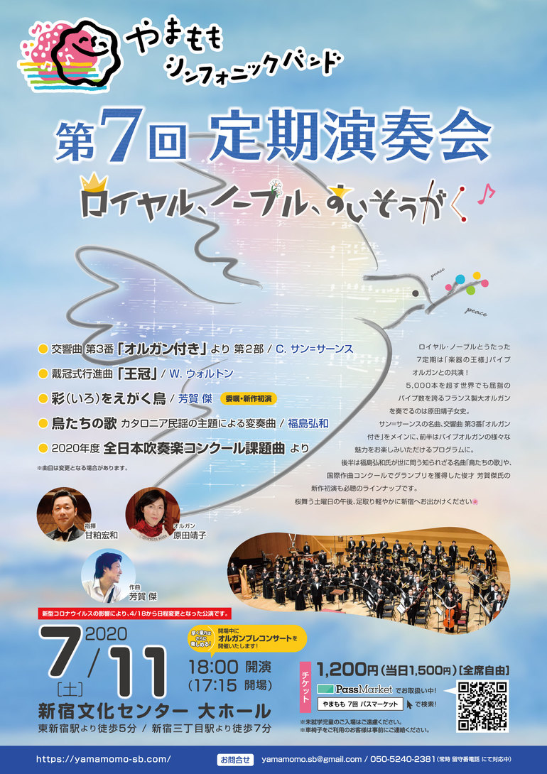 先の見通せない日々が続いている中、皆さまからのお力添えによって、私たちやまももシンフォニックバンドの存在意義をあらためて確認し見出すことができ、さらには自負を持って活動して参る気持ちをさらに強めることができました。長引く自粛の中、7月の延期公演も未だ不確実な状況ではございますが、“音楽は心のビタミン、音楽は心のレストラン!”を胸に、開催を信じ精進して参ります。
