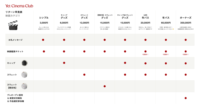 リターンがわかりづらいとのフィードバックを受けて、早見表を作成しました。読書・映画・応援の3つのカテゴリで、シンプルからオーナーズまで段階的なリターンをご用意しています。