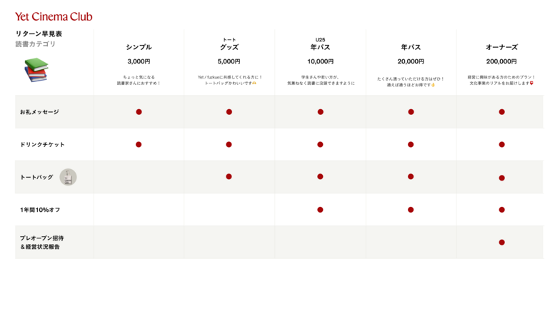 グッズはどれもかわいいのでぜひゲットしてほしいのですが、個人的にはYetの文化経営的チャレンジの側面もおもしろがっていただきたく、お高いですがオーナーズプランおすすめです!自分でも映画館つくりたいけどすぐにはできない!という方、いつかカフェ開いてみたい!という方、オーナーズプランでは経営情報を可能な限り開示しますので、ぜひ文化経営のリアルを目の当たりにしてください!