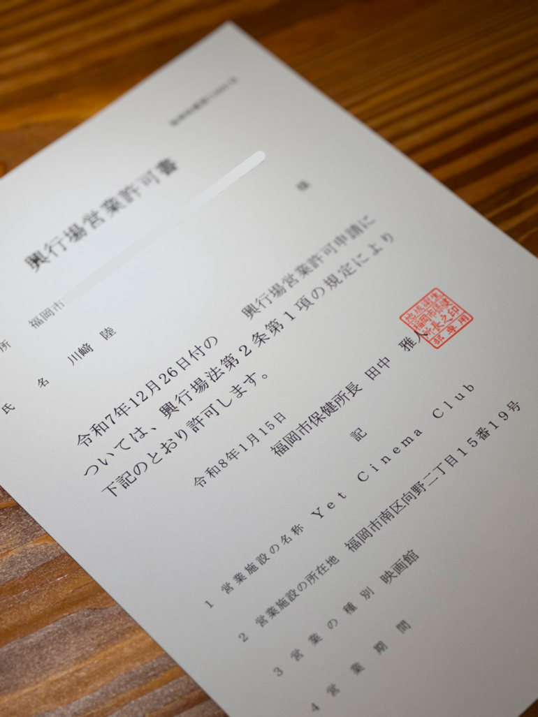 今朝、福岡市南区役所からご連絡があり、興業場としての営業許可書を受け取ってきました。
