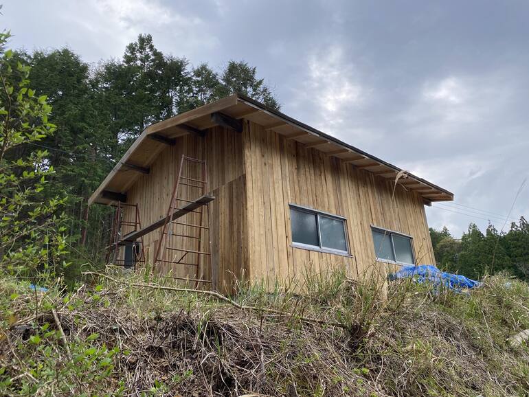外壁には自分たちが伐採、製材した板材やいただいた廃材を活用して、通称「拾ってきた小屋」として、現在は刻みの作業を進めるスペースとして活用しています。