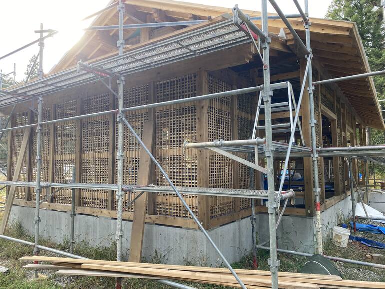 9月上旬に竹小舞かきワークショップを開催し、その後も助っ人の方や左官屋さんのけんちゃんに助けられながら、一部だけできあがった土壁の下地、竹小舞。