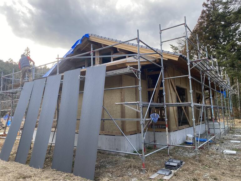 しかしながら、1月には「瓦葺き祭り」と称して、仲間を募り、瓦を屋根上にあげたり、瓦を実際に打ち付ける作業をお手伝いしてもらいながら、上記の写真のような状態まで終わらせることができました!