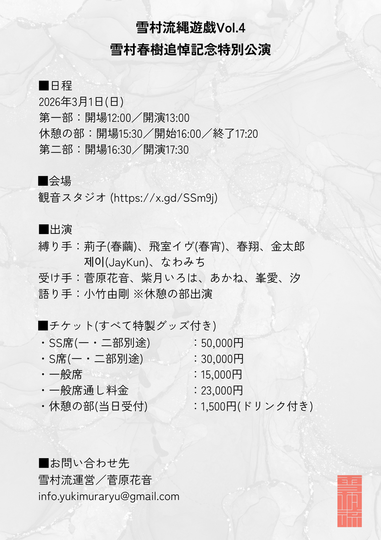 雪村流は、故・雪村春樹が遺した思想と美意識を基盤とする、縛りの表現を「技術」ではなく「対話と表現」として捉える流派です。