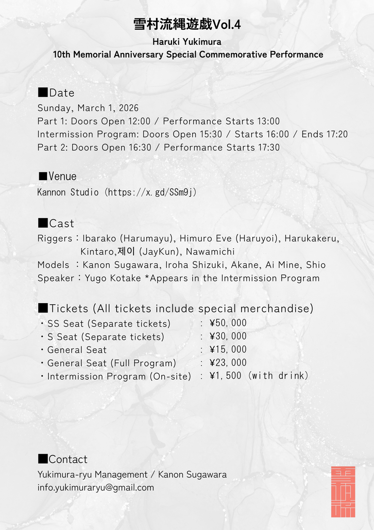 Yukimura-ryu is a school of kinbaku based on the philosophy and aesthetic vision left by the late Haruki Yukimura.