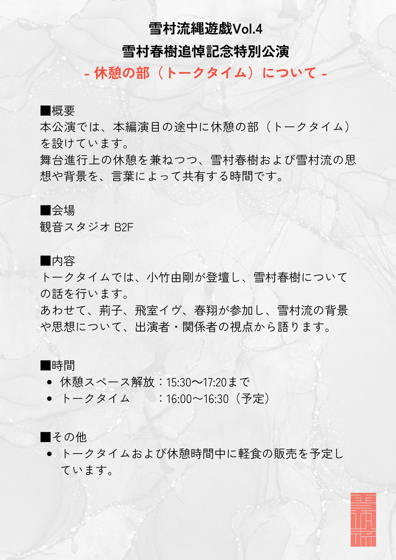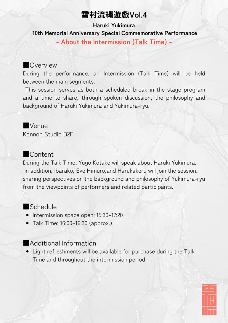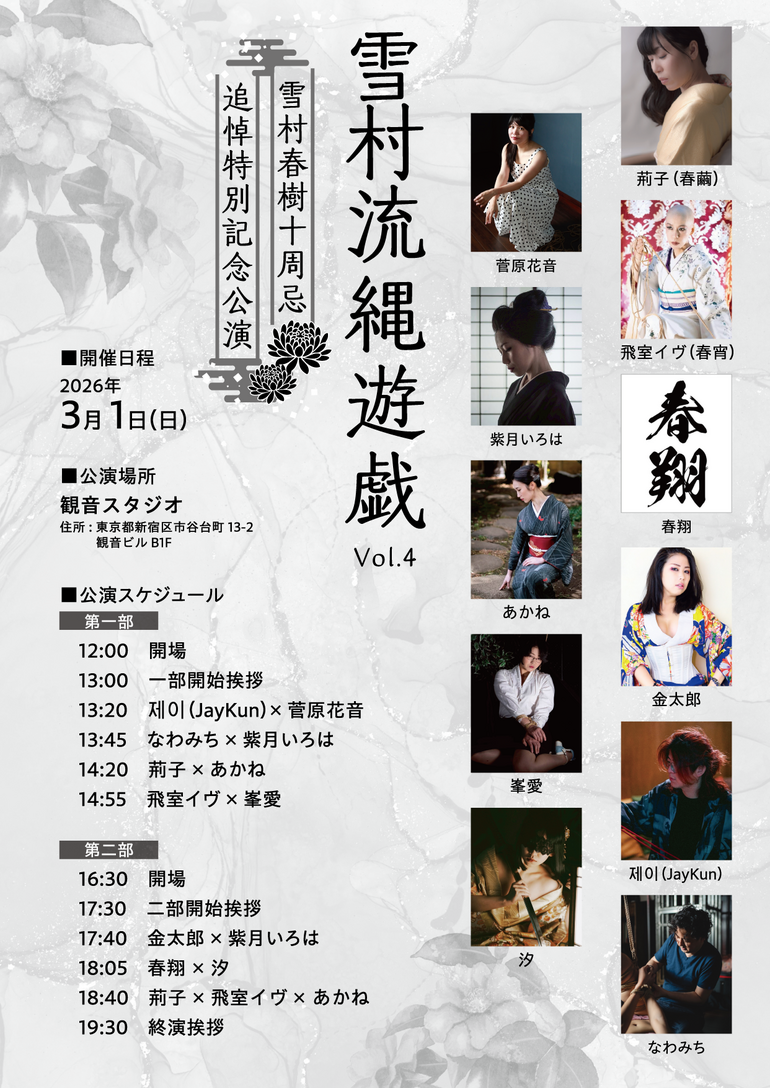 雪村流の創始者・雪村春樹の没後十年を偲び、思想と表現を次世代へ繋ぐ追悼特別記念公演を開催いたします。本公演は昼夜二部制にて実施予定です。