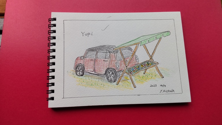CAFE YUPIのリノベーションを手伝ってくれた「旅する大工さん」が描いてくれたラフスケッチ旅の相棒、愛車ハスラー。購入時に漠然と思い描いた「10年20万km」を2025/9に達成!行商の相棒でもあります