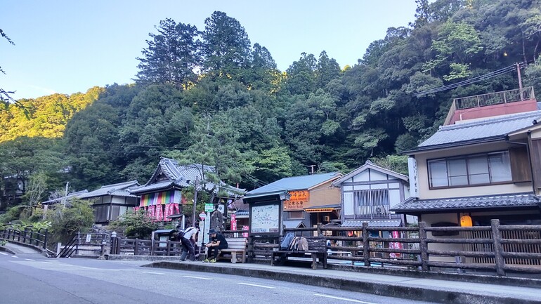 湯の峰温泉の中心、朝はハイカーの行列ができるバス停。