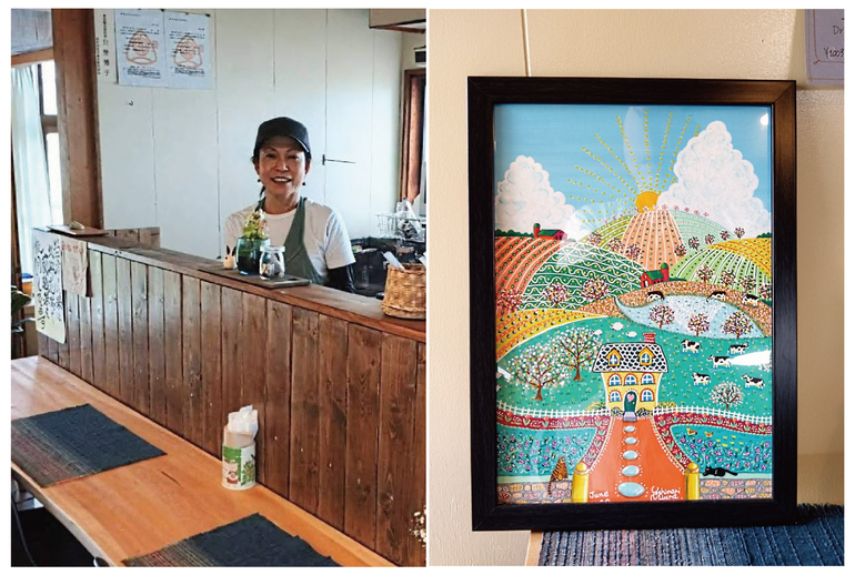 右)町の名士にゲストハウスYUPIをイメージして描き下ろしてもらった作品(牧歌的風景の中に建つ宿)左)CAFE YUPIの店内。一枚板のカウンターテーブルも椅子も壁の色も…全てにストーリーがありました。