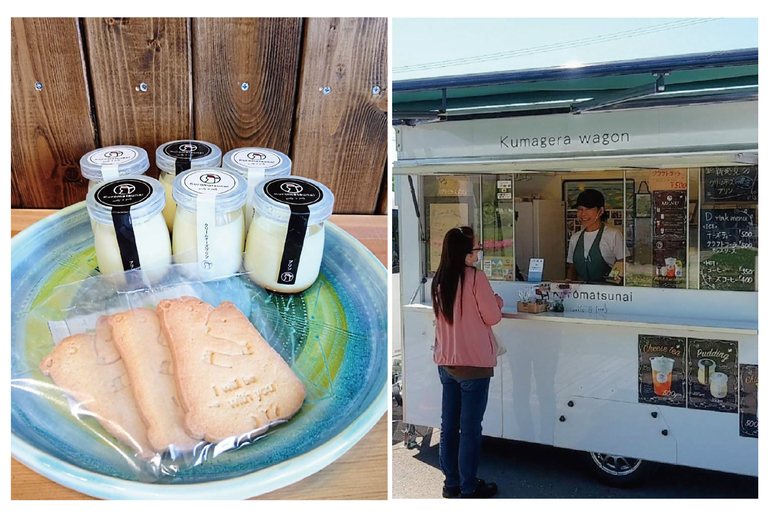 右)道の駅くろまつないに週末出没するキッチンカー。愛称「クマゲラワゴン」 左)主力商品、プレーンとクリームチーズのプリン&クッキー。レシピは昔から子どもたちに作っていたもの。